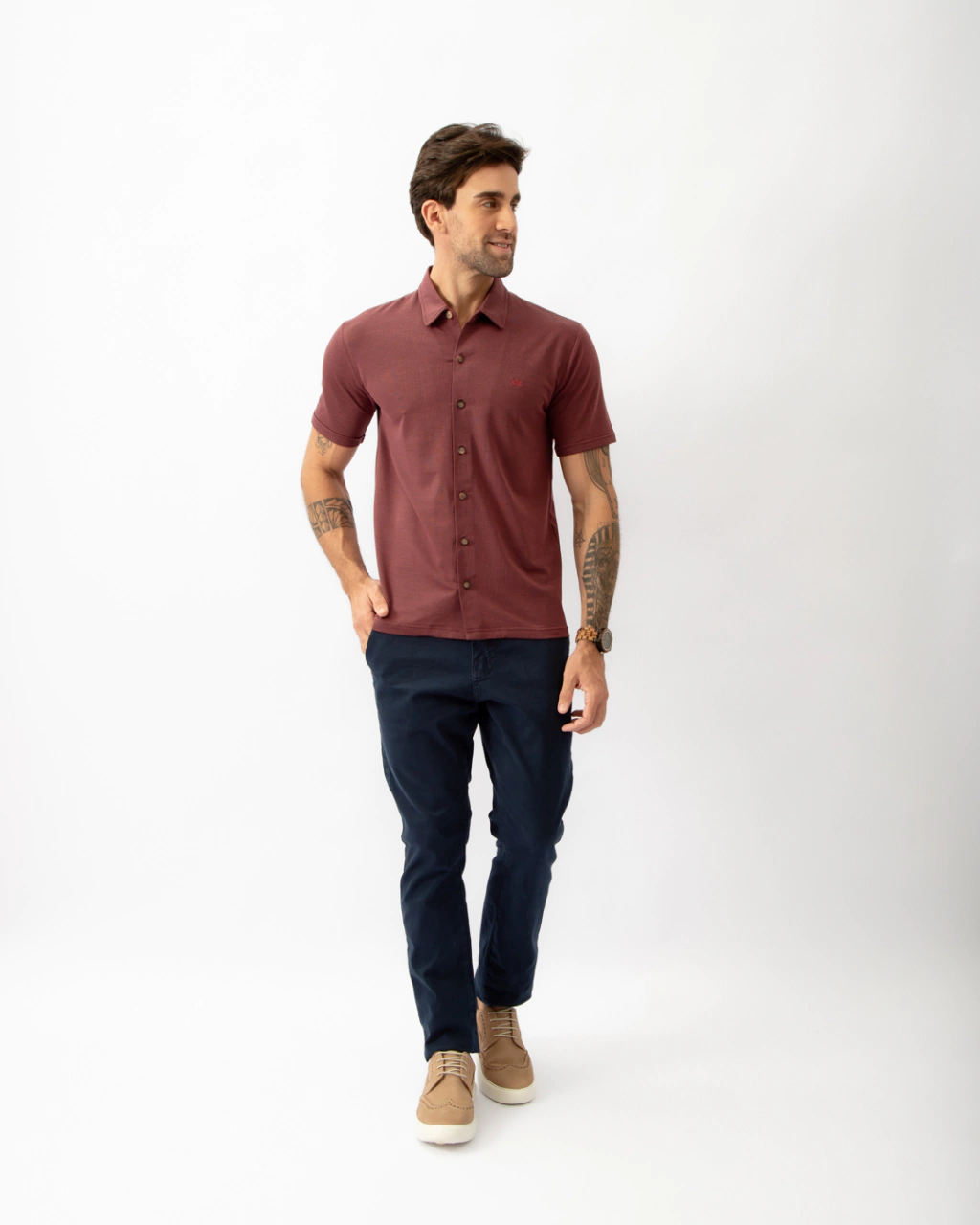 Essa camisa destaca-se por sua leveza, conforto e caimento. Essa modelagem nesse tecido traz uma inovação no conceito de camisa, um modelo mais despojado e ao mesmo tempo sofisticado.