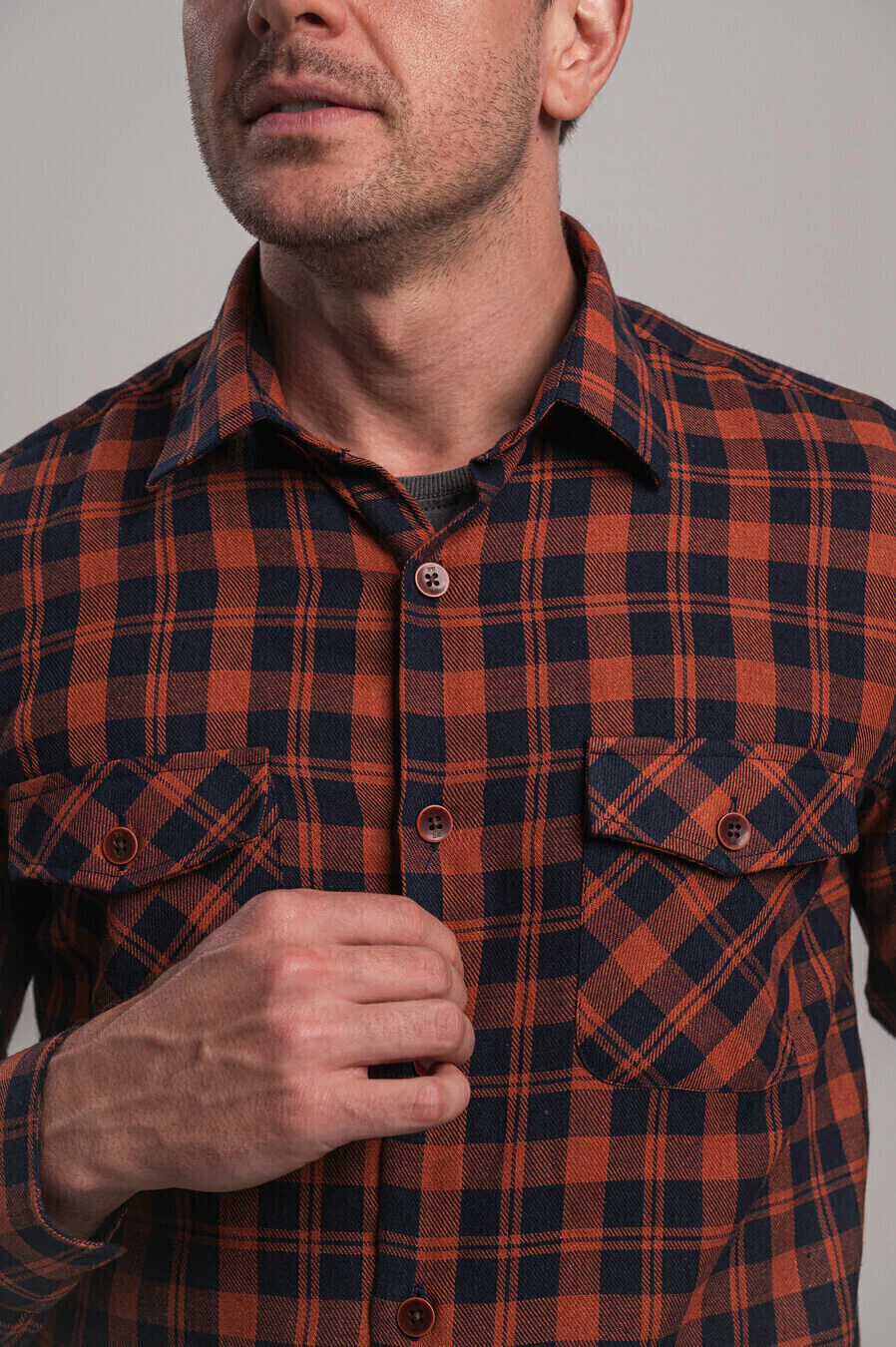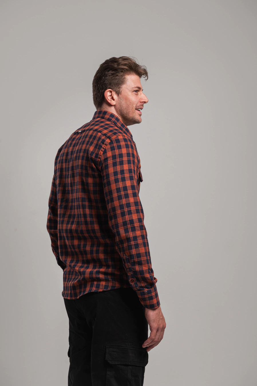 Camisa manga longa TRT flanela xadrez na cor laranja. Possui dois bolsos com tampa e botão, colarinho maleável e modelagem slim.